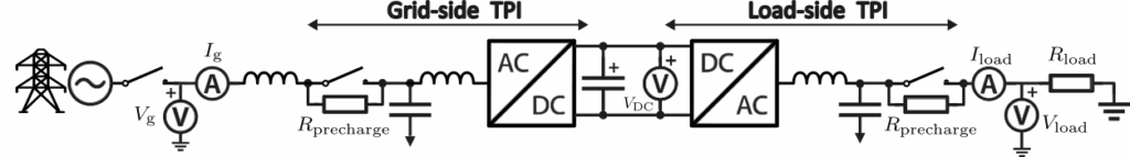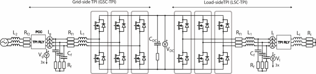 A back-to-back converter consists of two three-phase converters, typically an AC/DC rectifier stage and a DC/AC inverter stage, connected via a common DC link. The detailed three-phase diagram of the system is illustrated in Fig. 2. This configuration effectively decouples two AC systems, allowing for independent control of power flow, frequency, and voltage. In this application, both converters are implemented using the imperix TPI8032 three-phase power converter; therefore, the DC link capacitors of both are connected in parallel, resulting in a doubling of the DC link capacitance.