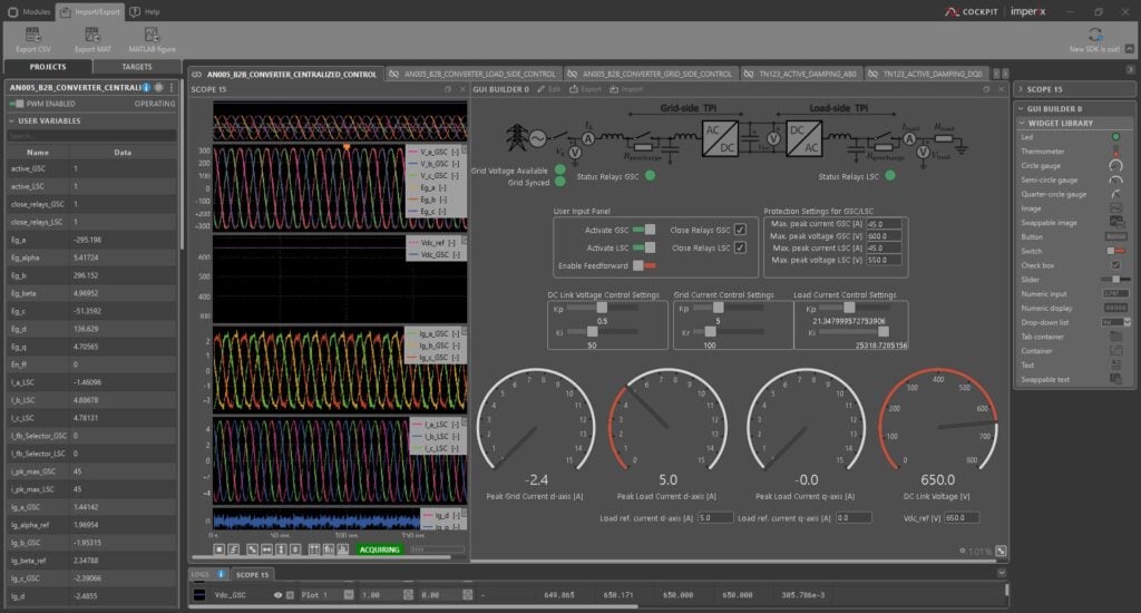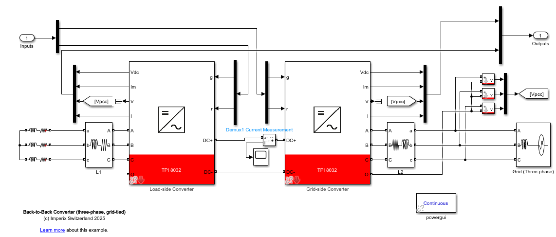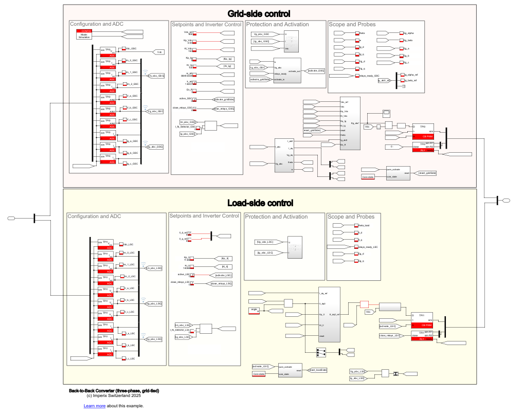 The control of the back-to-back converter is implemented in MATLAB Simulink using the imperix ACG SDK.