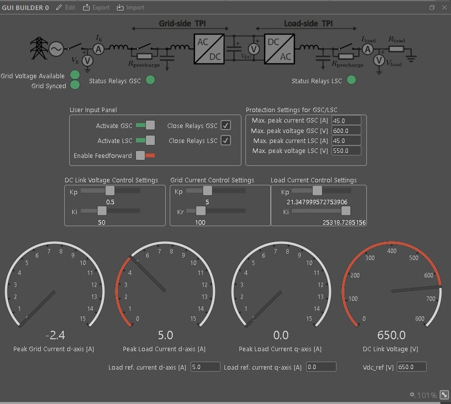 - Real-time visualisation: circular gauges for peak d/q currents (grid & load) and a large DC-link voltage gauge for quick status.