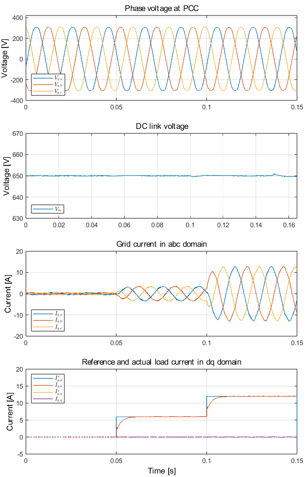 The TPI Relays of both converters were closed after the DC link was pre-charged and the PLL synchronized with the grid voltage. The DC link voltage is then stabilized around its reference value of approximately \(650~\text{V}\), as shown in the second subplot of Fig. 11. Feedforward is enabled for this experiment. It can be seen in the second subplot of Fig. 11 that the deviation of the DC Link is less than 2V on a change of load current, thanks to the feedforward of load current. The phase voltages at the PCC, illustrated in the first subplot, are balanced and sinusoidal with a \(120^{\circ}\) phase displacement.