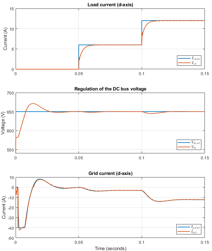 Analyzing the simulation results shown in Fig. 7, the grid currents (d-axis) follow their references with a minimal instantaneous error. During the transient, as well as during steady-state, the grid current is \(180^{\circ}\) out of phase with the grid voltage, as specified by the reference (Ig_q_ref = 0
