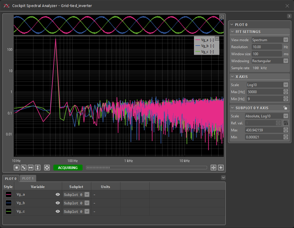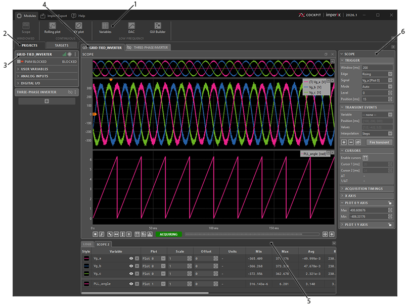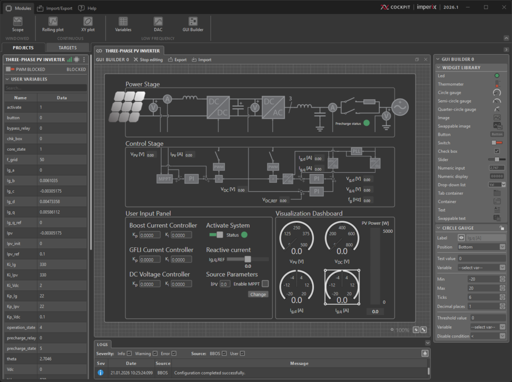 Cockpit is the monitoring software included with both the ACG SDK and CPP SDK. It is designed to facilitate the experimental testing of power electronics systems by leveraging the hardware capabilities of imperix programmable controllers.