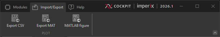 To export data from a rolling plot or a scope module, click on the Export CSV, Export MAT, or MATLAB figure button located in the Import/Export tab of Cockpit’s top bar, as displayed below.