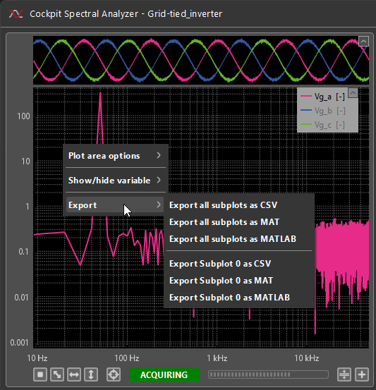 Cockpit offers the possibility to export the plotted signals acquired with the Scope and Rolling plot modules as a CSV or MAT file, or directly as a MATLAB figure.