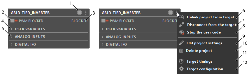 The project pane offers a centralized view from which the user can pilot their imperix controller. It also allows quick access and an overview of all of the control variables defined in the user code.