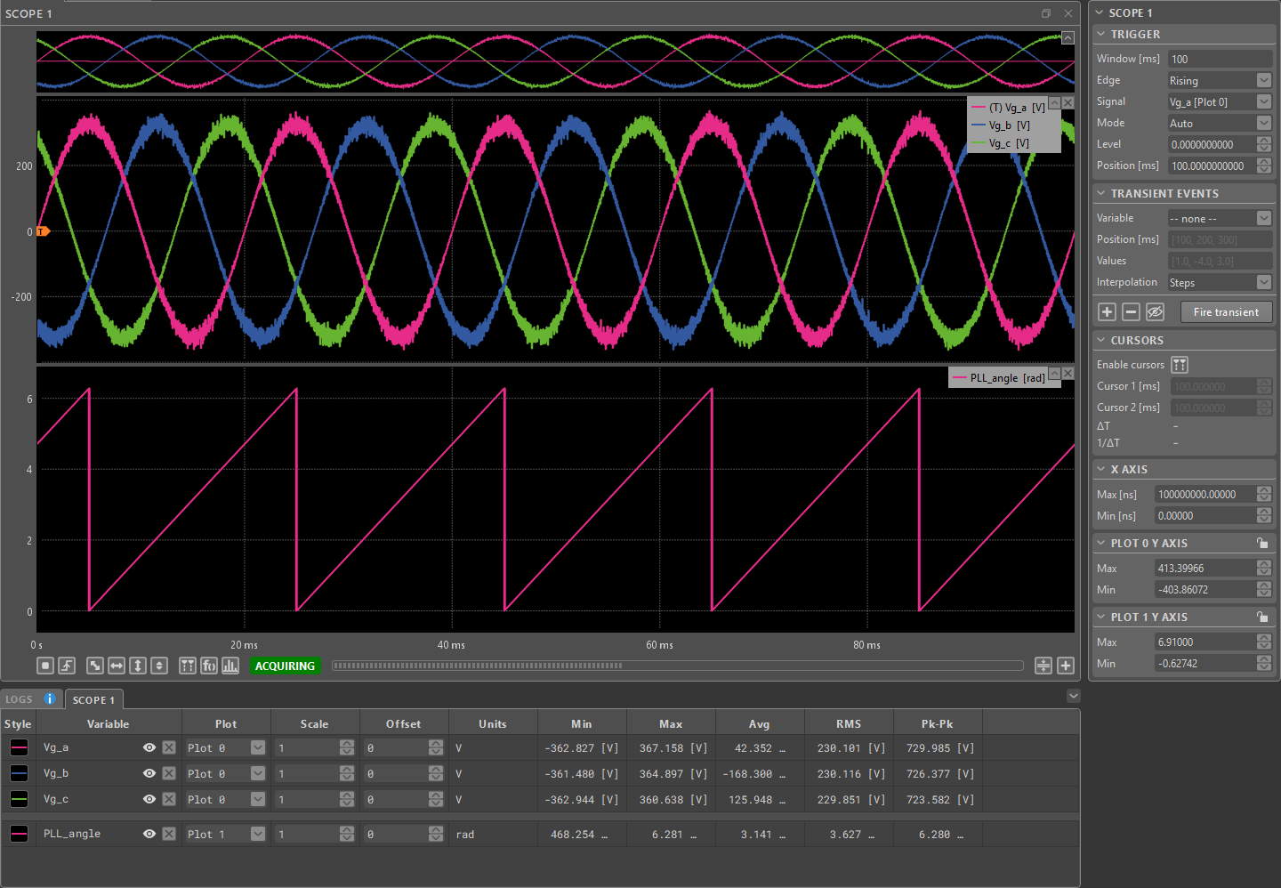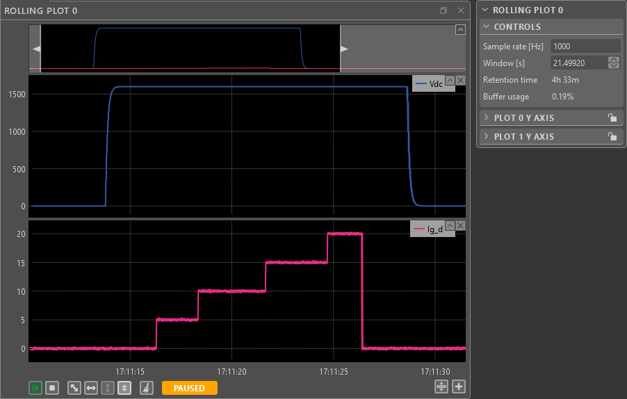 The rolling plot module allows for more long-term monitoring of the selected variables. A typical use case is monitoring the long-term evolution of the converter state in order to keep an eye on critical variables.