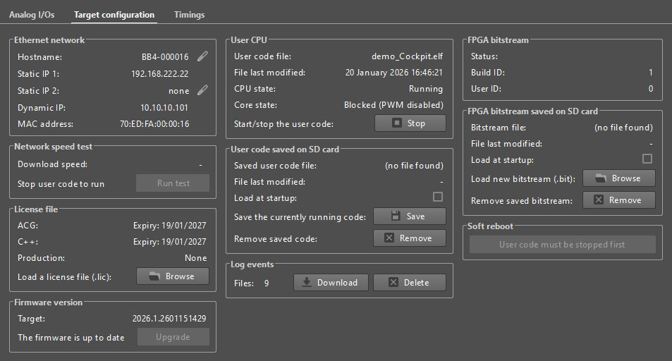 The Target configuration tab, also accessible from the three dots menu of a project pane, displays basic information about the controller and allows the user to manage licenses and firmware versions and interact with the controller memory by saving user codes, FPGA bitstreams and downloading controller logs from its SD card.