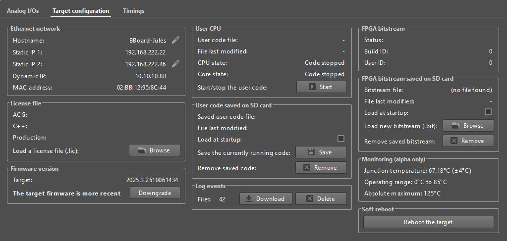 The Target configuration tab, also accessible from the three dots menu of a project pane, displays basic information about the controller and allows the user to manage licenses and firmware versions and interact with the controller memory by saving user codes, FPGA bitstreams and downloading controller logs from its SD card.
