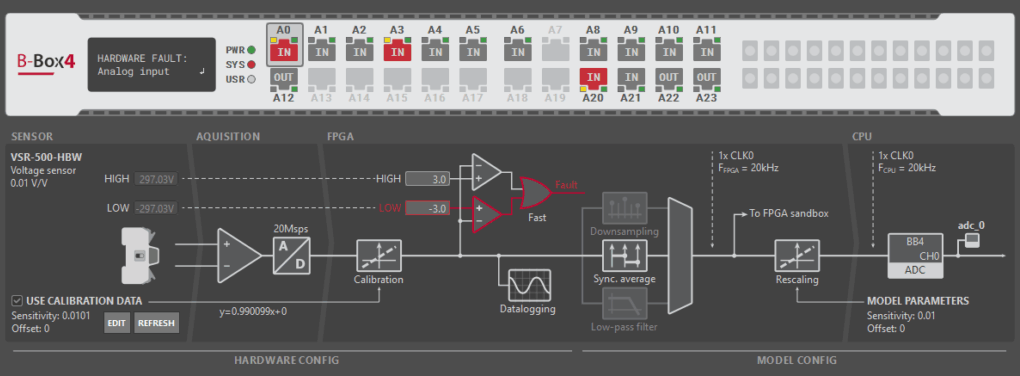 - ADC acquisition delay shows the delay between a sampling event and the availability of the values in the FPGA. It comprises the ADC acquisition delay and the transfer time of the read value to the FPGA. This value is 2000 ns in the B-Box RCP and 500 ns in the B-Box Micro and B-Board PRO. The appropriate value must be set from the CONFIG block.