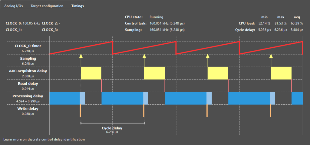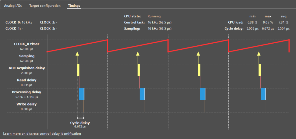 The Timings tab, also accessible from the three dots menu of a project pane, provides a graphical representation of the various computation and communication delays involved in the controller during run-time. It is particularly useful to observe the delays involved in the control dynamics of the system as explained in Identifying the discrete control delay (PN142). The control parameters, such as the \(K_p\) and \(K_i\) of a PI controller, can then be adjusted accordingly, as shown in Basic PI control implementation (TN105).