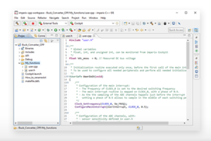 The picture below shows the coding environment of the imperix C++ IDE. The project template contains several folders (as shown in the Project Explorer on the left), which are organized as follows.