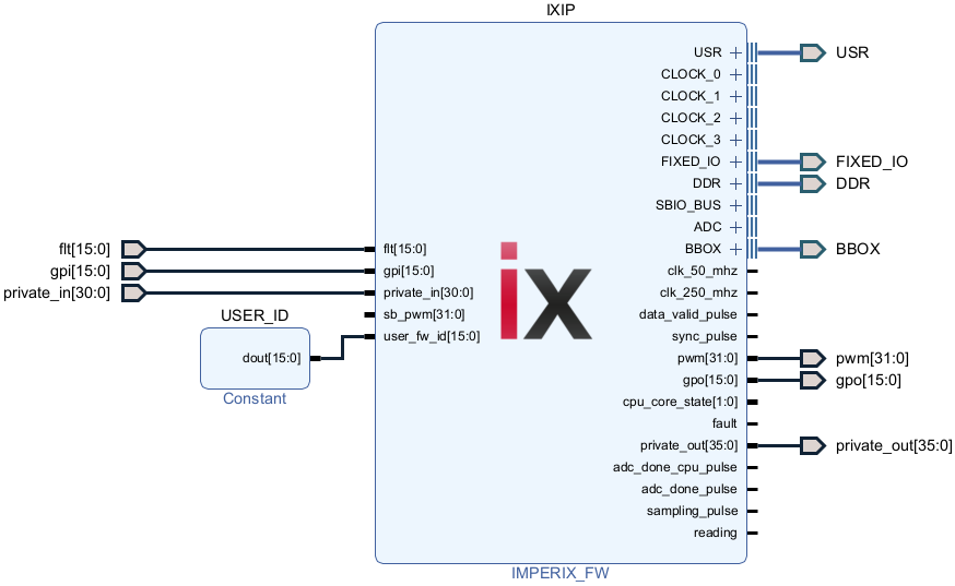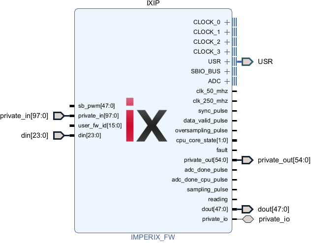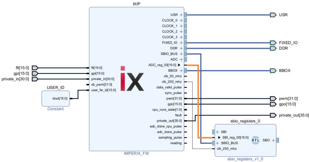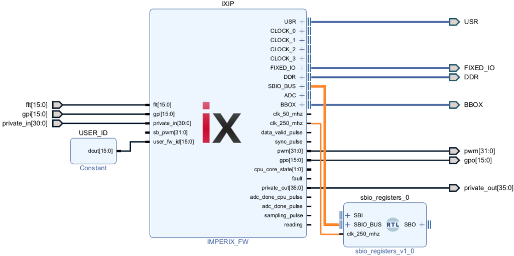 The imperix firmware IP contains the imperix proprietary FPGA logic and provides various interfaces enabling the user to retrieve ADC measurement results, exchange data with the CPU through the SBIO_BUS, drive the PWM from the sb_pwm port, etc.