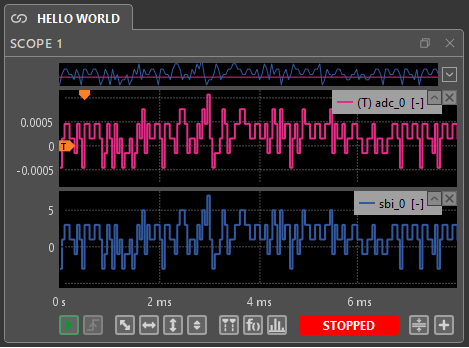 As illustrated below, the bitstream is tested by comparing the result from an ADC block (configured with a sensitivity of 1.0 and and offset of 0.0) with the SBI block. Observing both signals in the Cockpit Scope module confirms that both waveforms have the same shape, but their amplitude differs. The difference exists because the scaling required to convert the int16 data into physical units has not yet been applied. This conversion is documented in PN126.