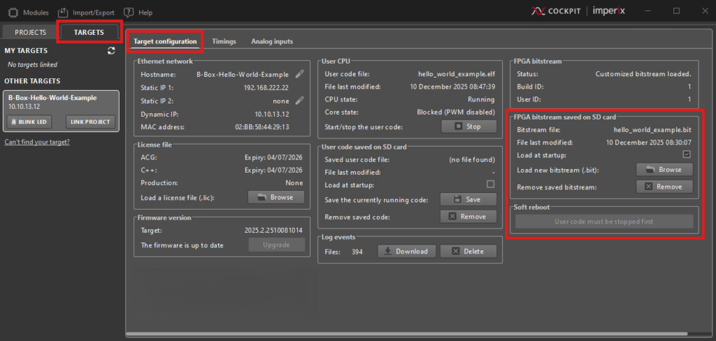 - In the FPGA bitstream area, click on Browse and load the new bitstream on the target.