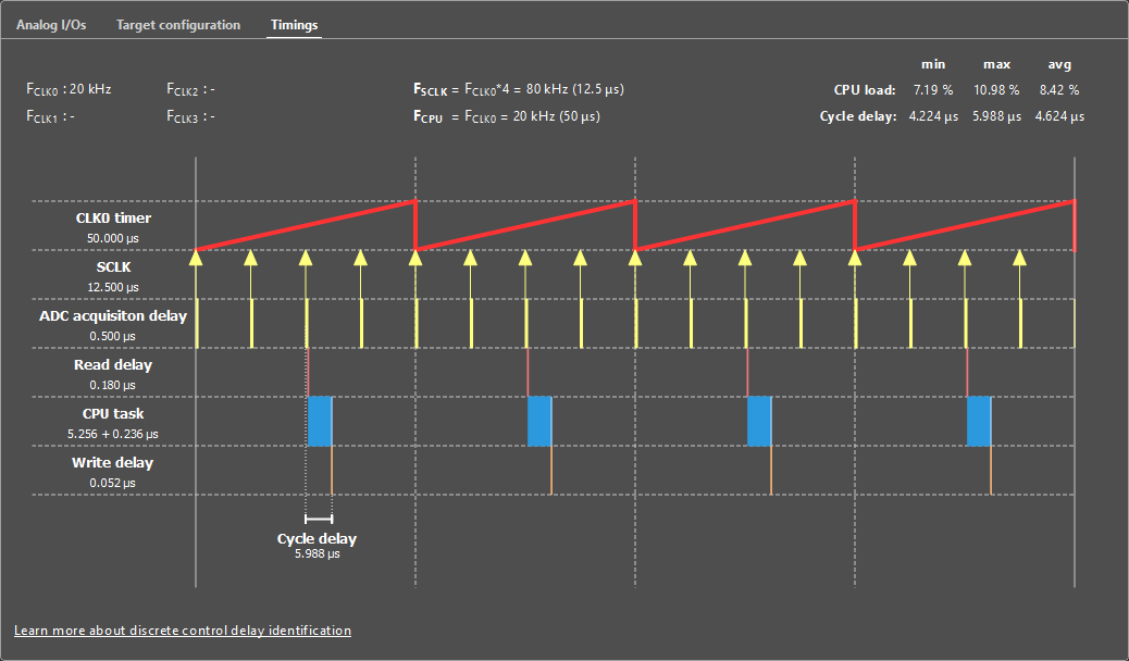 The Timings tab in Cockpit displays where the ADC sampling events are occurring. To learn more about the Target timings tab, please refer to the Cockpit user guide.