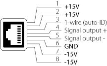 Measurements are accessible through RJ-45 connectors according to the pinout shown below. The external controller must supply ±15V (>10 mA) to power up the output amplifier of each analog chain. Also, the 1-wire line (pin 3) should either be left floating or connected to GND.