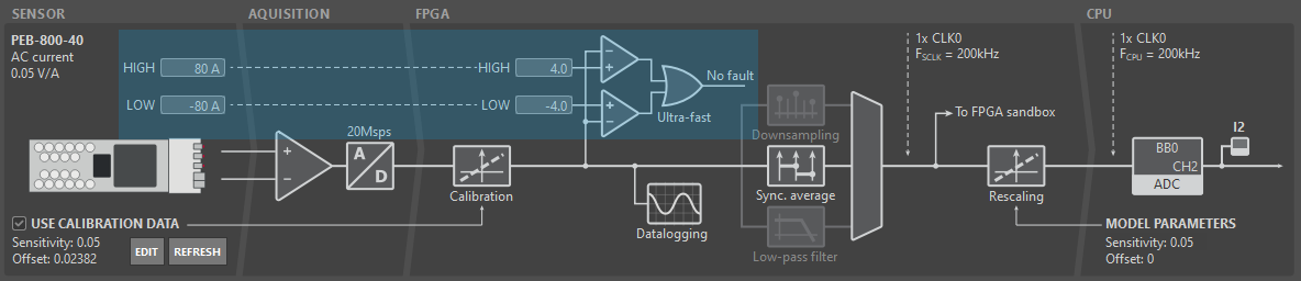 - Sensor: The integrated current or voltage sensor can be selected in the dedicated drop-down list to automatically load the correct sensitivity and offset. With B-Box 4, while the offset can be adjusted in the model, it is recommended to use the factory calibration data instead, as this parameter is intrinsically different for each device.