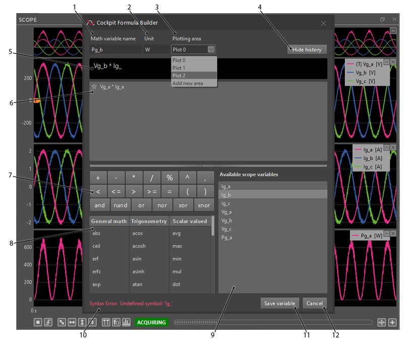 The math variables are calculated on the PC side after the acquisition of a scope window. This alleviates the need to define every variable to monitor in the user code, saving on hardware resources while still allowing the user to track them live through Cockpit. This also saves time, as new math variables can be added or their formula edited without having to recompile the user code.