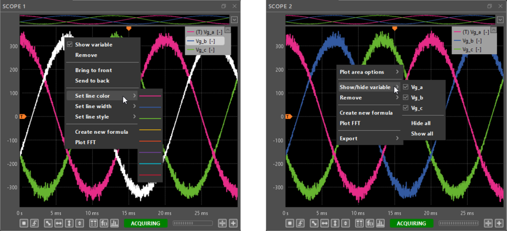 - Many of the Scope functionalities can also be accessed through context menus by right-clicking on a plotted variable or on the empty space in the plots.