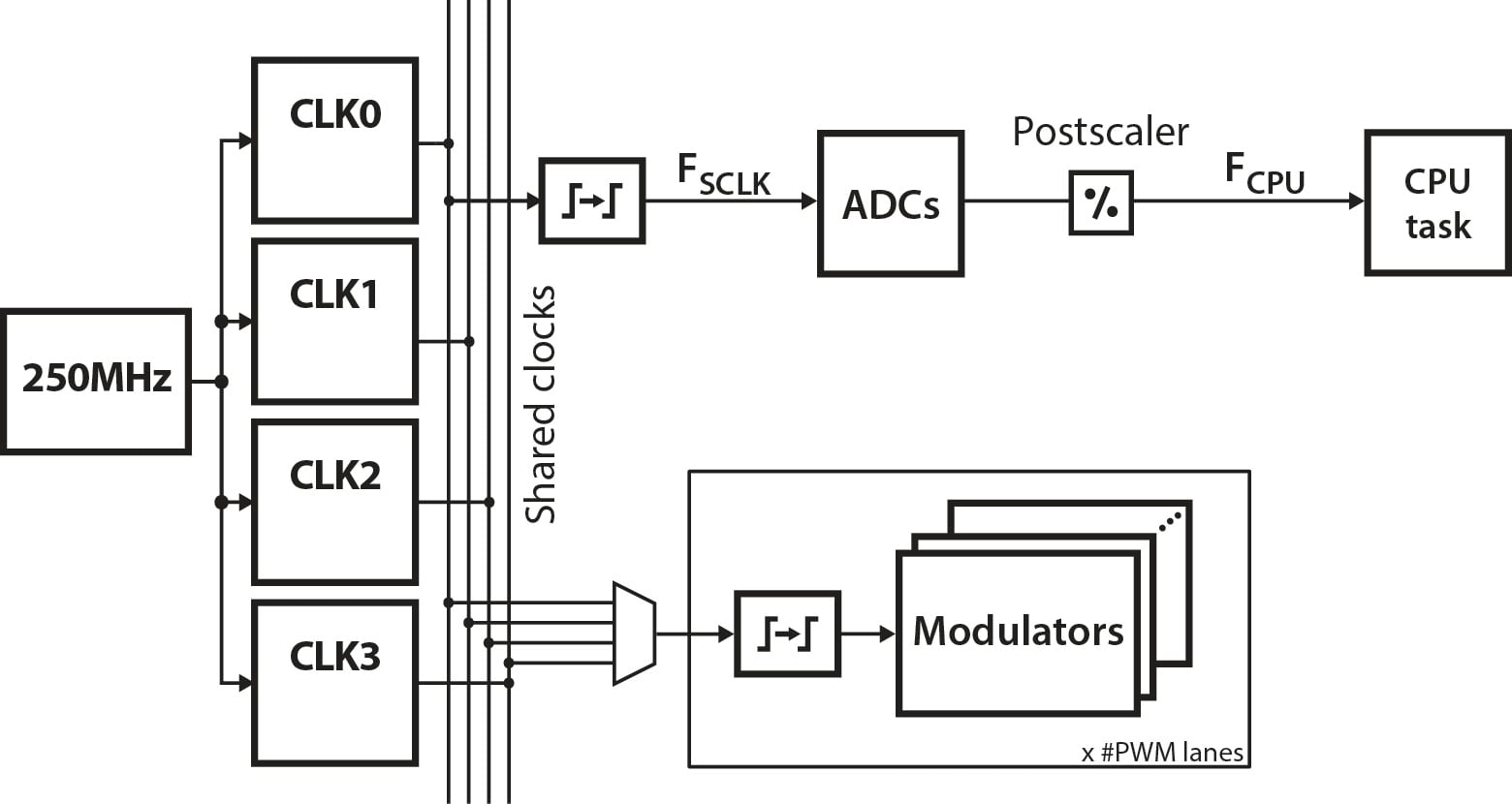 The system also supports multiple phase-locked timing domains, maintaining precise synchronization across different frequencies in complex timing configuration. To accommodate various hardware requirements, the 250 MHz clock is divided into four distinct clocks, CLK0 through CLK3 (see Fig. 1), which can then be allocated to resources such as ADCs, PWM modulators, and CPU interrupts.