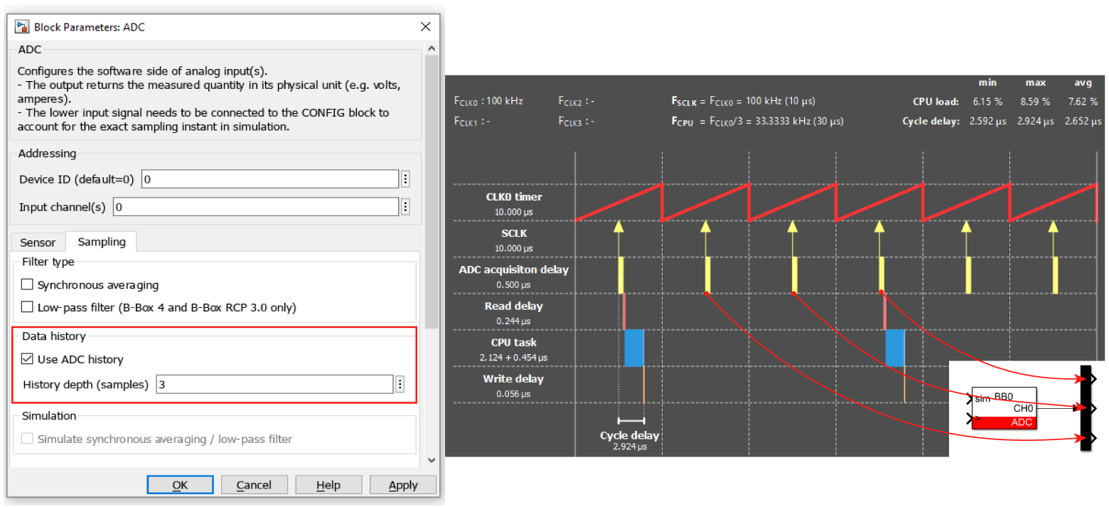 Imperix controllers also offer the ability to retrieve sampling data captured between CPU interrupt interrupts through the ‘data history’ feature of the ADC block. This functionality is particularly advantageous when using a postscaler, as it enables the control algorithm to access the complete set of samples acquired during the preceding decimated interval. As illustrated in Fig.11, this ensures that all intermediate data points are available for processing, regardless of whether they were captured before the current CPU task was triggered.