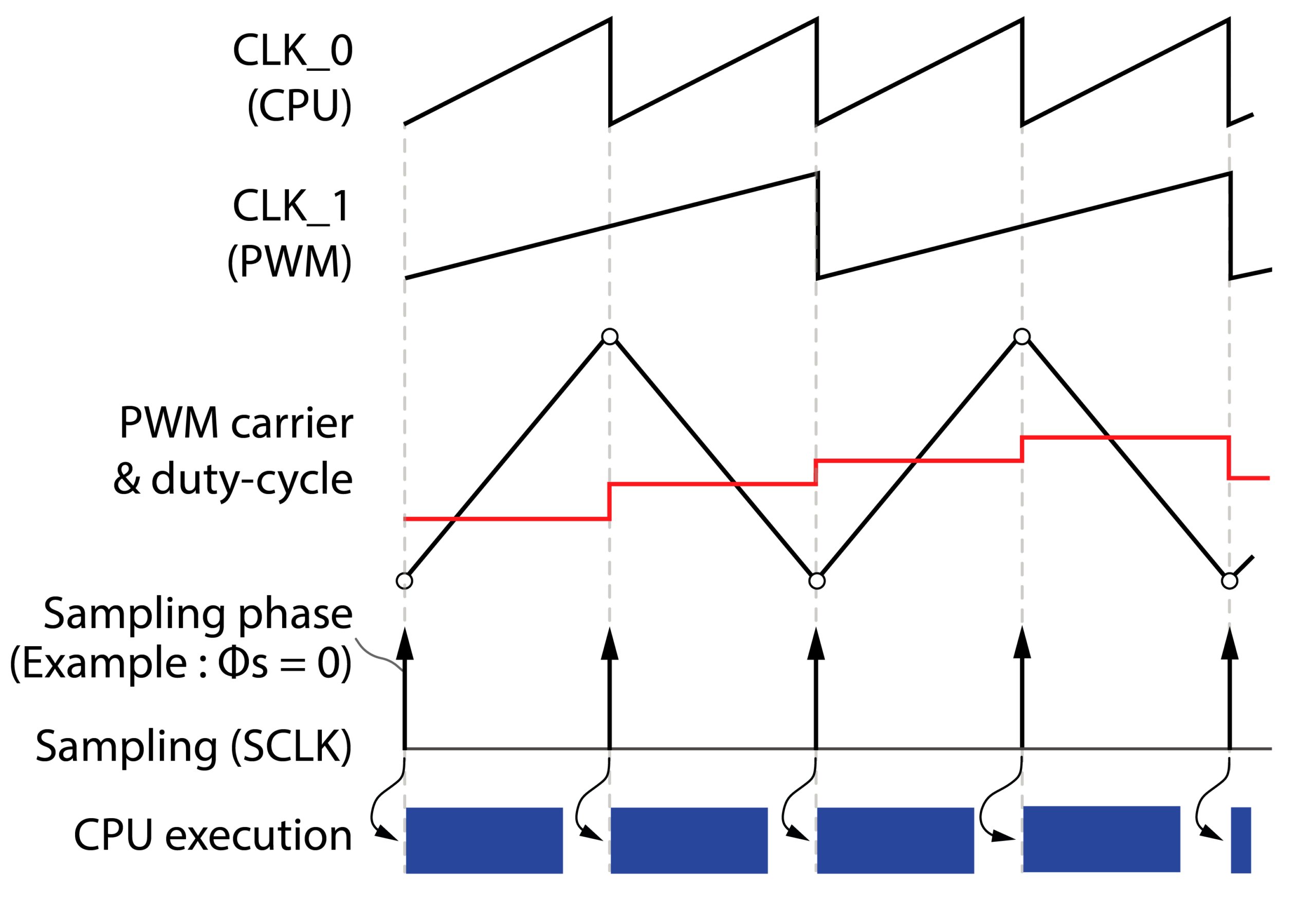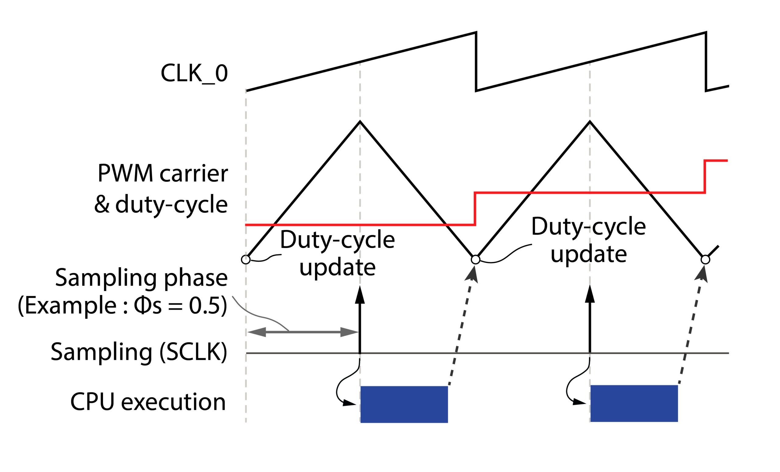 While the CPU operates at this reduced rate, the sampling frequency remains synchronized with CLK0. This decoupling is particularly advantageous when controlling interleaved converters. In such topologies, the sampling phase must be specifically shifted for each converter leg to capture the current at the ideal moment. Consequently, the sampling frequency must be \(N\) times faster than the CPU execution rate, where \(N\) represents the number of legs.