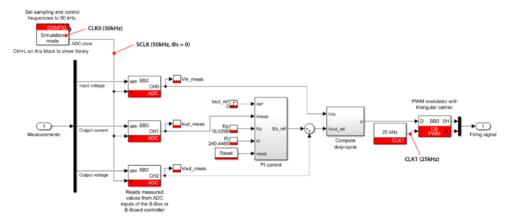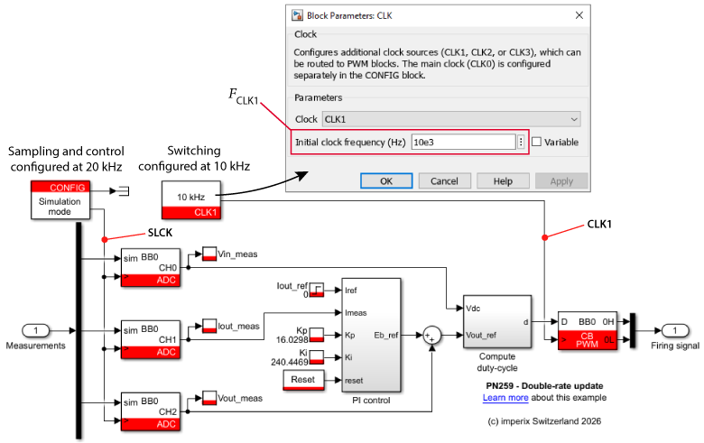 From an implementation perspective, Fig. 9 summarizes the corresponding block-level structure and clock assignments for a double-rate update closed-loop buck setup. Reference Simulink and PLECS models implementing this configuration are provided below and can be used as a starting point for application-specific designs.