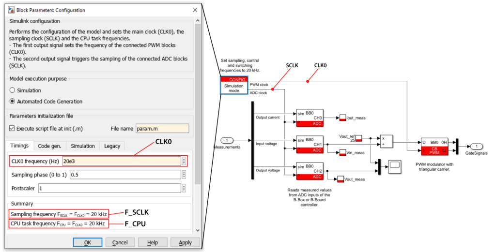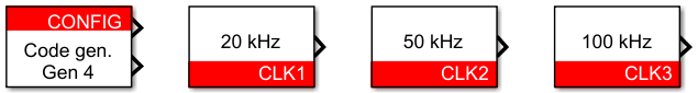 The CONFIG block is mandatory for every Simulink or PLECS model. Among its various functions, it handles the configuration of CLK0 and its associated signals. In contrast, CLK blocks (CLK1–3) are optional and can run at variable frequency. These clocks are only used to drive modulation blocks (PWMs), whenever the PWM time base must differ from CLK0. Further details regarding the simulation of these blocks can be found on the PN135 and PN137 pages.