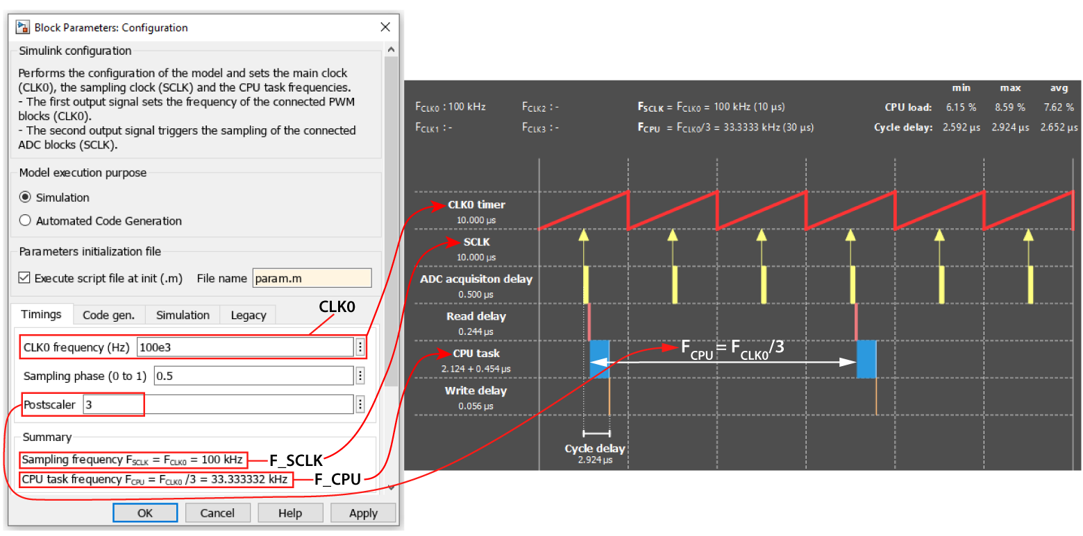 Both Simulink and PLECS provide the flexibility to execute specific parts of a control algorithm at a lower frequency than the main execution rate (\(F_{\text{CPU}}\)). As this is managed via dedicated software blocks, it requires no modifications to the controller’s timing configurations. This function is described in more detail in PN145 – Multi-rate control with Simulink and PN155 – Multi-rate control with PLECS.