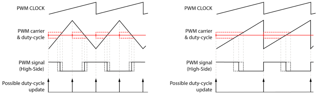 - Double rate update, in which case the control task is executed twice per PWM period, and duty cycles are updated twice per PWM period.