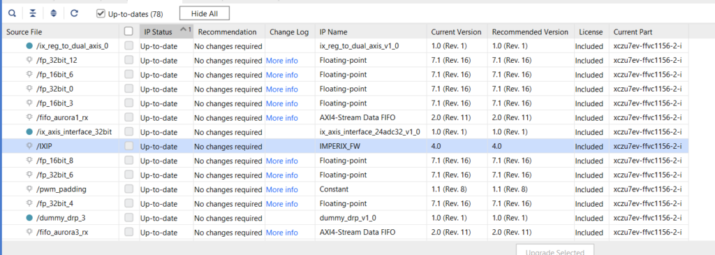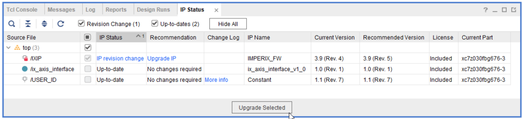 In Vivado, go to Reports → Report IP Status and look for the IMPERIX_FW IP. The version is shown in the “Current Version” column. If no revision number is displayed, the revision is 0.
