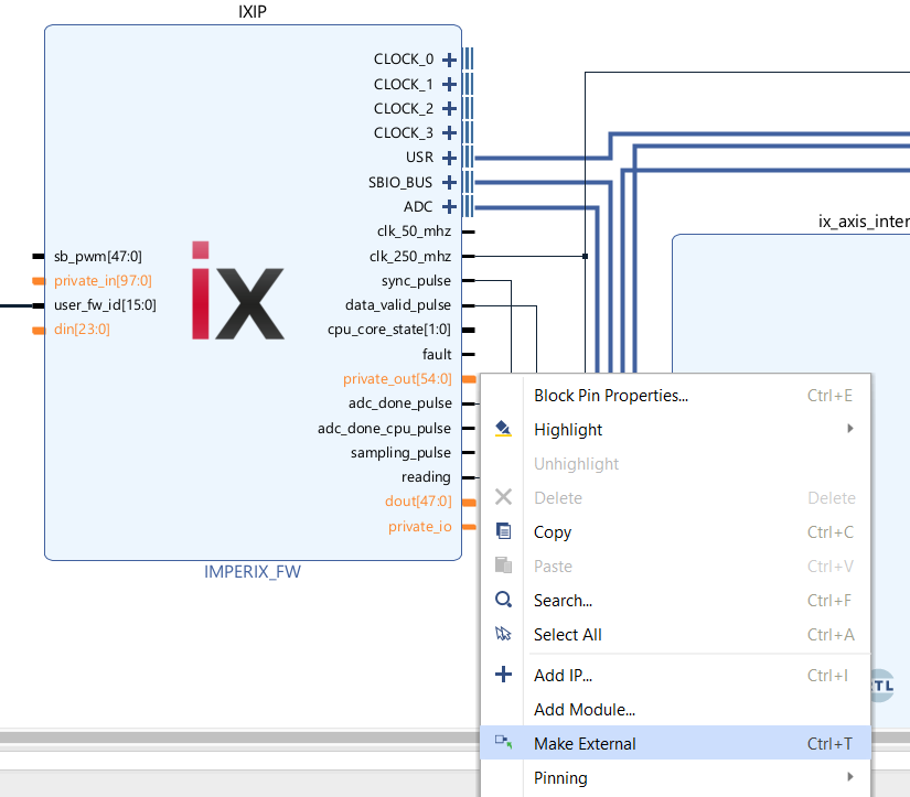 2. On the IXIP block, right-click the private_in, din, dout, private_io, and private_out pins and select Make External.