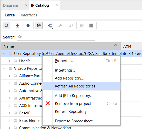 FPGA_Sandbox_template_*.zipfor the target SDK version from the Downloads page and unzip it. - Replace IP folders: In