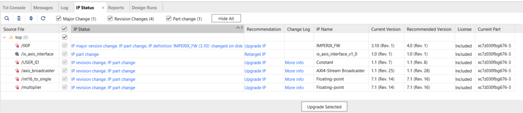 - Right-click the imperix IP block → Upgrade IP