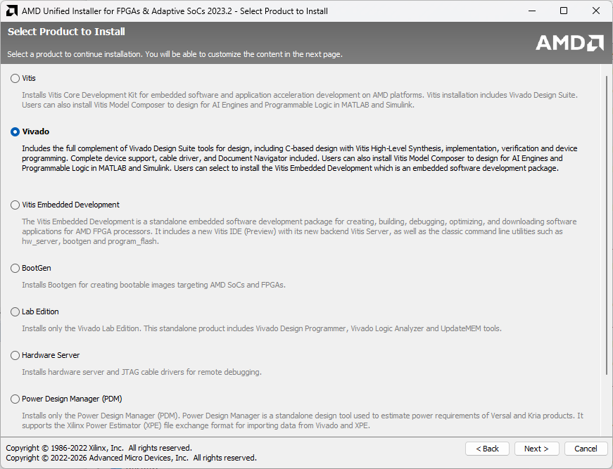 Vivado is installed via the AMD Unified Installer, which also provides: