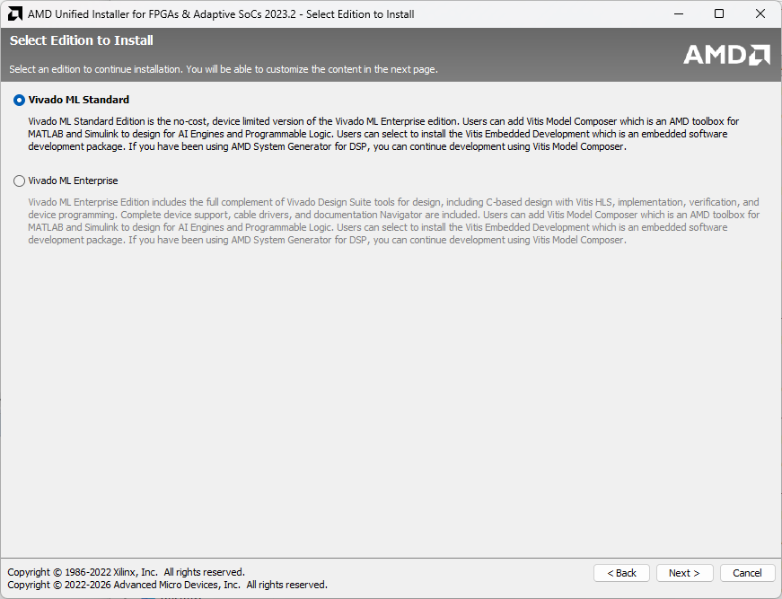 - For the free of charge version, select Vivado ML Standard.