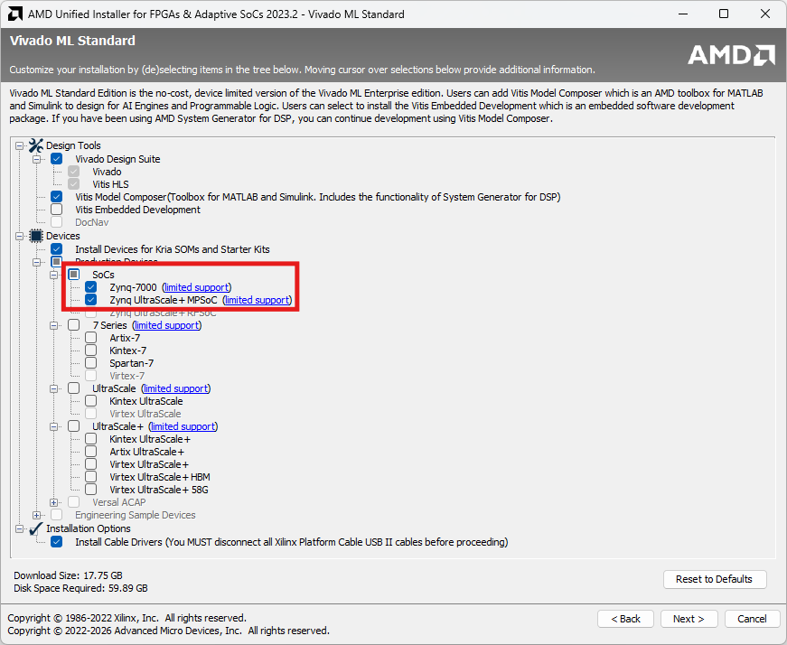 - Select the items to install. Other options can be installed later on via the Xilinx “Add Design Tools or Devices” app. The required items are: