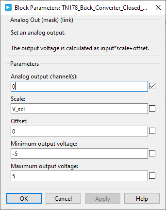 - Select the analog output voltage range to “-5V … 5V” in case DAC blocks are used as well.
