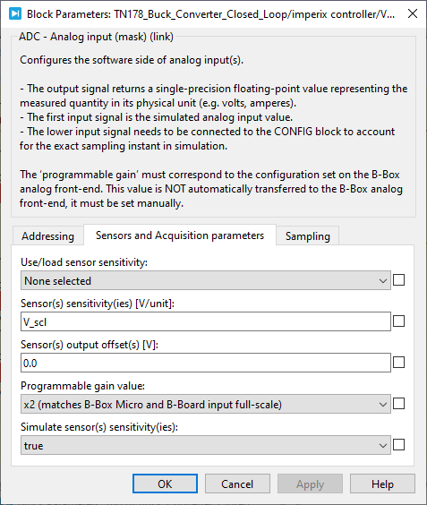 - Analog out blocks should be used on the RT Box to provide the scaled analog signal to the imperix ADC blocks. Scaling and min/max output settings are shown in Fig. 6. The scaling for each Analog out and the corresponding ADC block (Fig. 7) on the imperix side must be identical. This can be validated during offline simulation. As the B-Board PRO operates within ±5V, using this range on the RT Box too is recommended.
