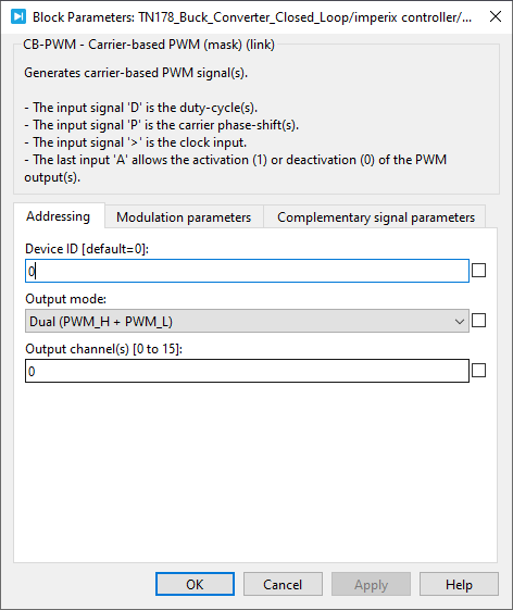 - The recommended settings for CB-PWM block are shown in Fig. 8. As both PWM signals are generated and transmitted to the simulator, reverse conduction is implemented in the lower MOSFET.