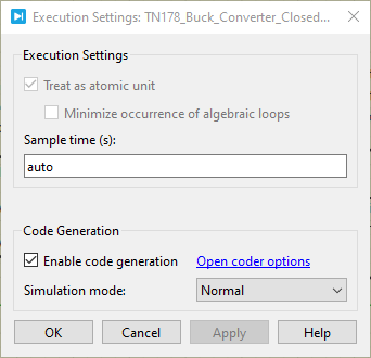 - The subsystem containing the control side must also be enabled for code generation. Right-click on the controller subsystem and selected subsystem–> execution. Then check “enable code generation”, as shown in Fig. 9.