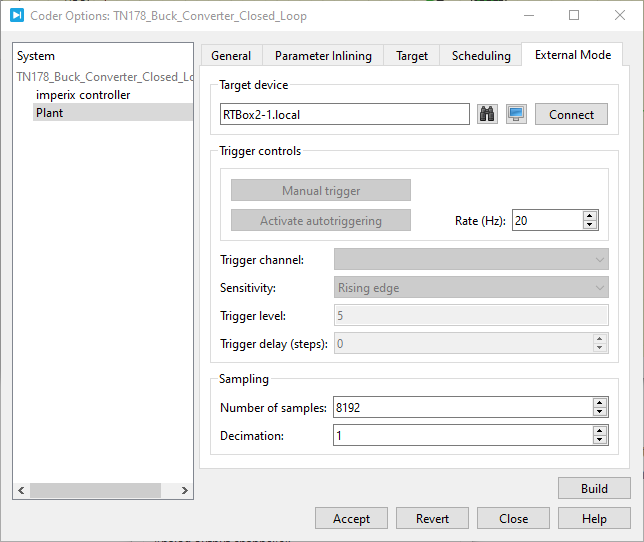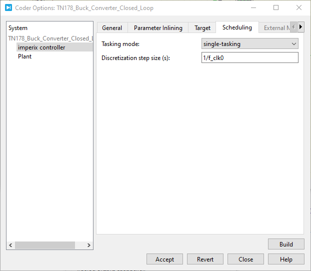 - In the PLECS environment, go to Coder→ Coder options. Select “plant” in the left area (under the model file name).