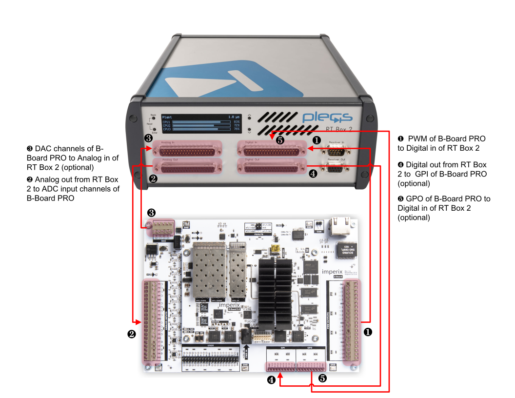 Effective data exchange between the RT Box and the B-Board PRO relies on several key blocks from the PLECS RT Box library (italicized below) and the imperix library (in bold red below). Below are the critical considerations for their implementation: