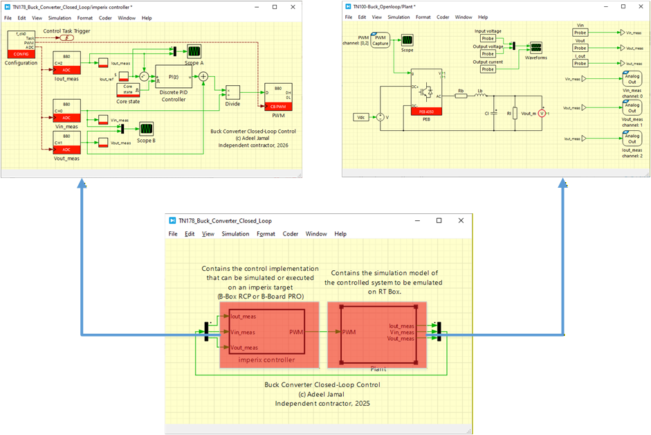A buck converter example is built in PLECS using the default template file provided by imperix. The controller and the plant are modelled in seperate subsystem as shown in Fig. 4.