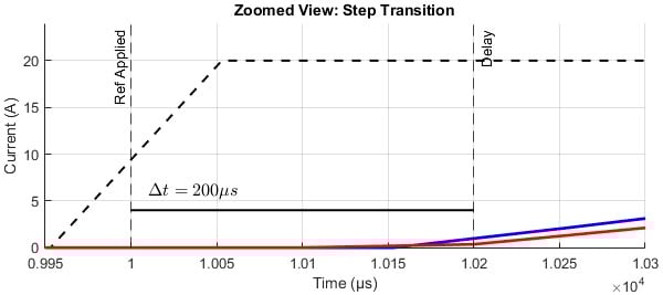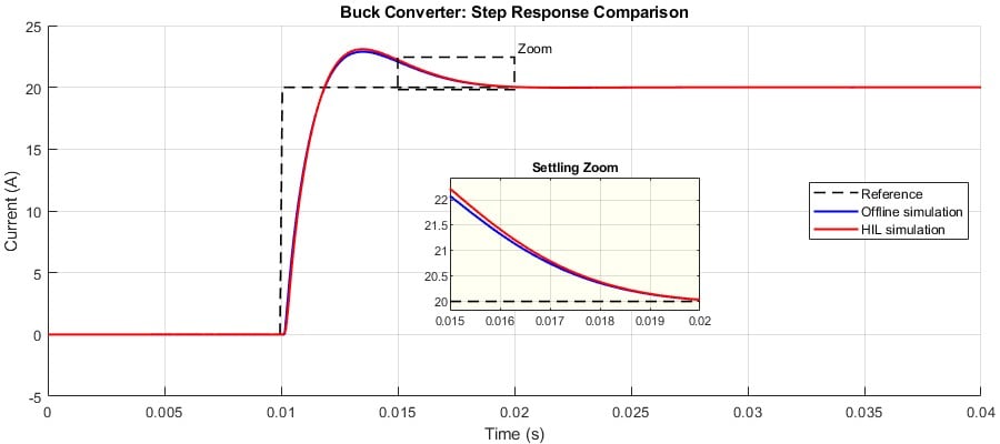 - By keeping the electrical and control parameters identical in both offline and HIL simulations, and by accurately modeling delays in the offline model, both results show an essentially identical response to a step change in the output current reference. The offline and real-time HIL waveforms align closely, as also seen in the zoomed settling-time view.