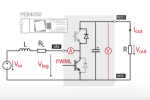 Using an IGBT power module, like the PEB4050 (or legacy PEB8032 and PEB4046), as a switching cell, the implemented circuit’s schematic is presented below.