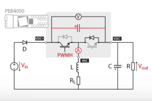 Using a MOSFET power module, like the PEB8038 or the PEB8024, as a switching cell, the implemented circuit’s schematic is presented below.