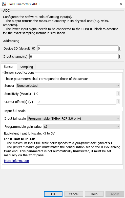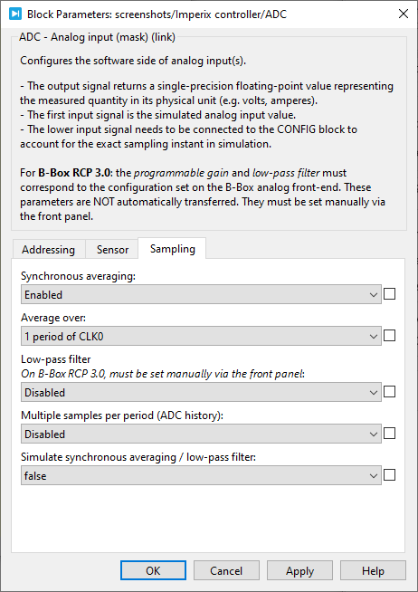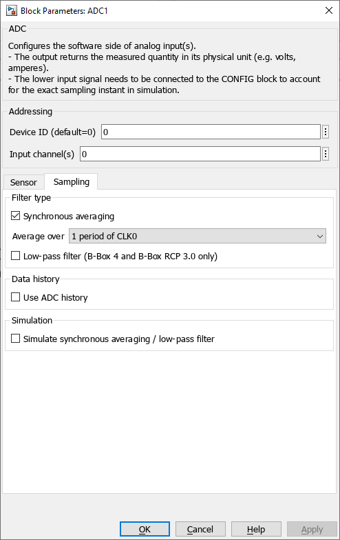 The ADC block (or C++ routines) are used to access data from a given Analog-to-Digital Converter (ADC) channel. They also serve to configure how this data is sampled, filtered, and rescaled, prior to being used inside the application-level user code. Together, these parameters constitute the so-called software part of the ADC channel configuration, as opposed to the hardware part.