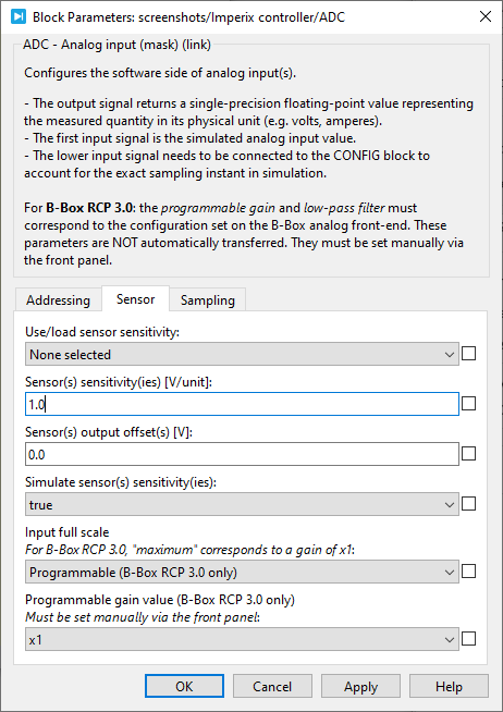 • The Sensor provides a list of imperix sensors. Selecting a sensor automatically populate the sensitivity parameter. When None is selected, the user must manually enter the sensitivity.