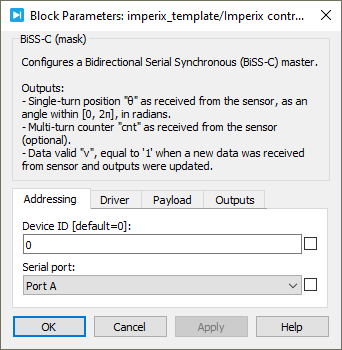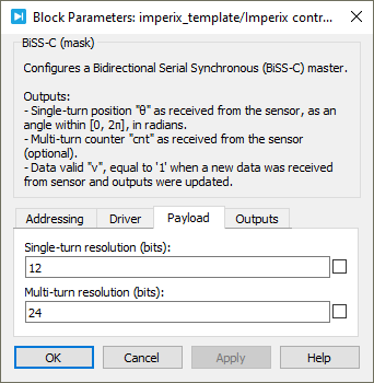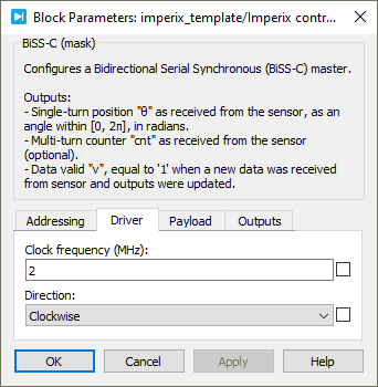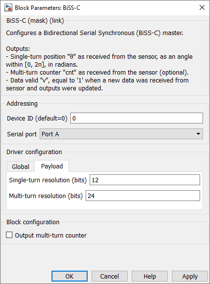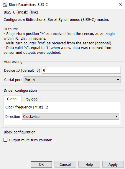 Device IDselects which device to address when used in a multi-device configuration.Serial portselects the serial port.Clock frequencyspecifies the transmission clock frequency for the BiSS-C communication, in MHz. The clock frequency cannot exceed 10 MHz, as defined by the BiSS-C standard.Directionspecifies the direction as clockwise or counterclockwise. When counterclockwise is selected, the output angle θ is 2π-θ’, where θ’ is the angle received from the sensor.Single-turn resolutionspecifies the resolution (i.e., number of bits) for the single-turn position. The single-turn resolution cannot exceed 32 bits.Multi-turn resolutionspecifies the resolution (i.e., number of bits) for the multi-turn counter. The multi-turn resolution cannot exceed 32 bits.Output multi-turn countershows or hides the multi-turn counter outputcnt.